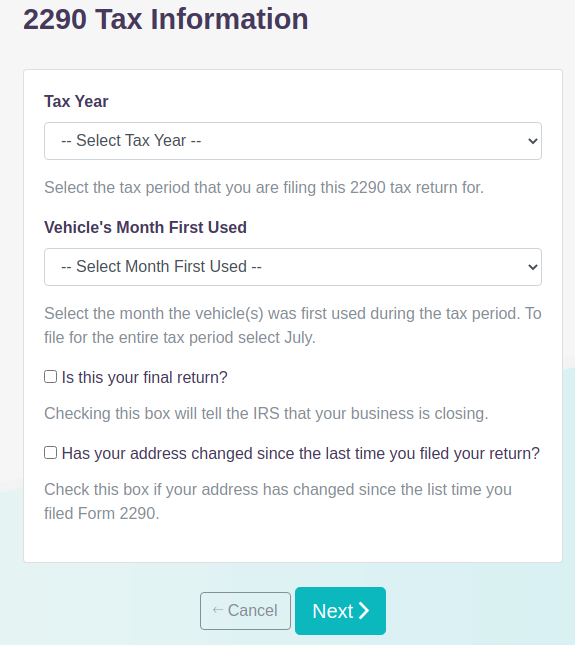 The system will walk you through each step of the process including where to add your vehicle identification numbers (VIN). You will start by selecting the tax year, entering your vehicle information, including the VIN (Vehicle Identification Number), taxable gross weight, and the month first used date. You can add multiple vehicles on a single 2290 filing.