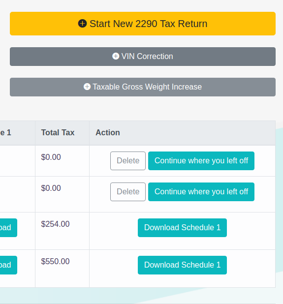 If you need to increase the taxable gross vehicle weight on one or more of your vehicles, you can file a Taxable Gross Vehicle Weight Increase Amendment for Form 2290. For example, if you were to increase the maximum load customarily carried on the truck, the taxable gross weight would increase requiring the weight category to be updated on the Form 2290 filing.